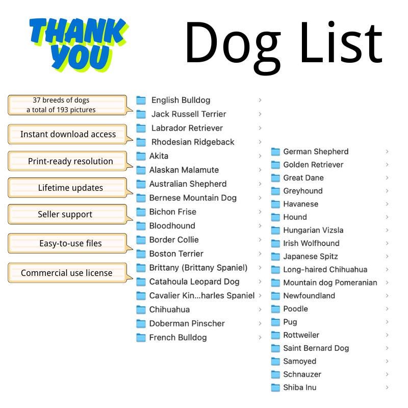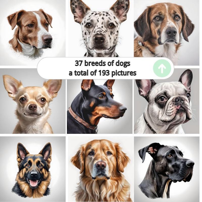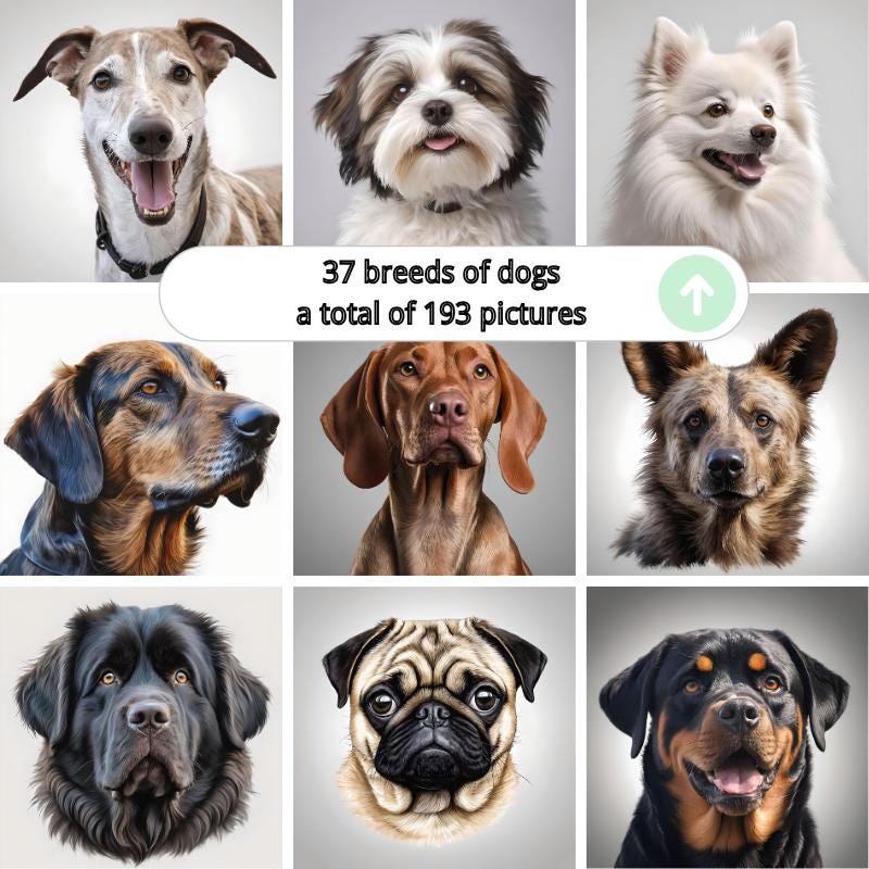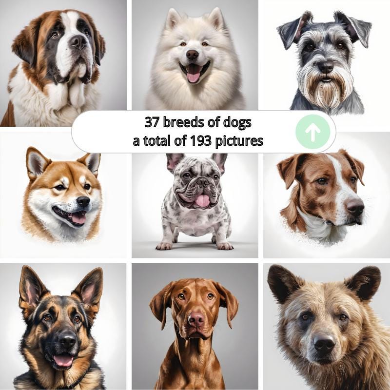 37 dog breed clip art packages, 193 JPG images, pets, German Shepherd, French Bulldog, Labrador Retriever, Hounds, Poodles, Shorthair dogs, commercial use T-shirts, mugs. This super large package contains 193 different dog photos in JPG format. It is very suitable for integrating into your design projects, such as greeting cards, stickers and wallpapers, dog T-shirts, dog souvenirs, etc.