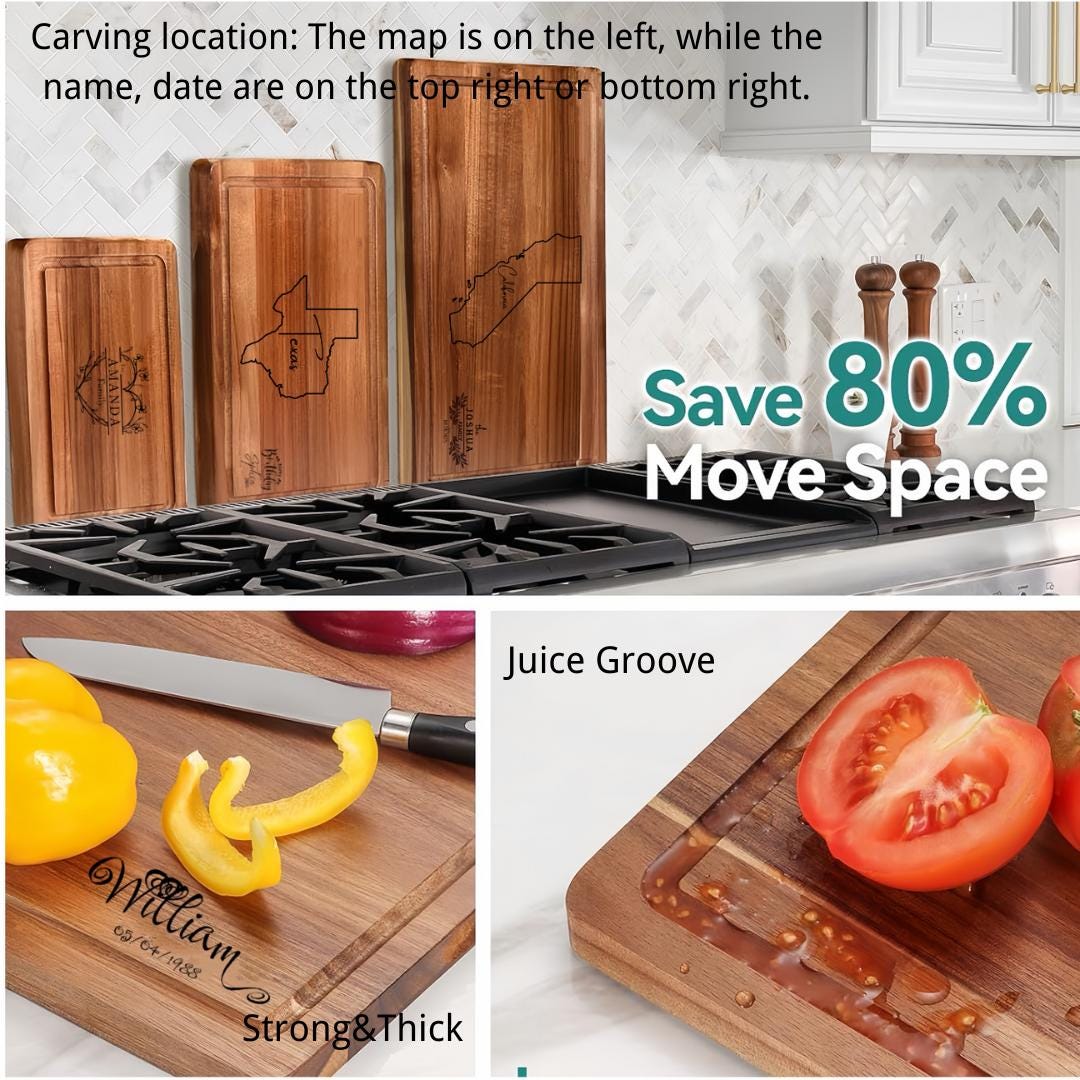 Double-sided chopping board: The side of the chopping board engraved with patterns can be used as a serving board, ready-to-eat dish board, or as a decorative item, adding warmth and precious memories to your kitchen. Its smooth surface makes it convenient and quick to hold food, and its elegant design can add a touch of sophistication to your space. This personalized chopping board can also be used as a cutting board or chopping board on the other side. Cut cheese and meat. This practical and fashionable kitchen essential will enhance your cooking experience.