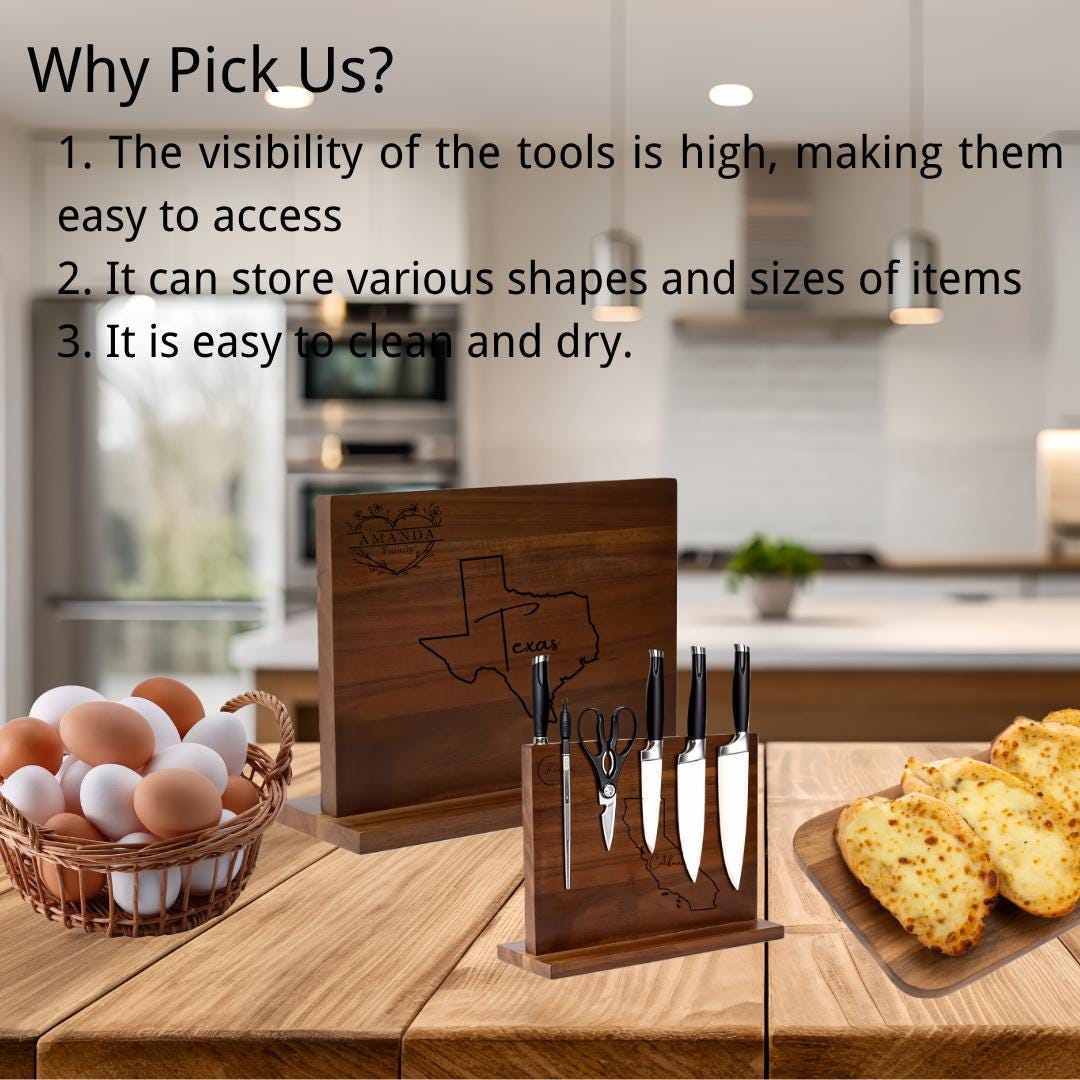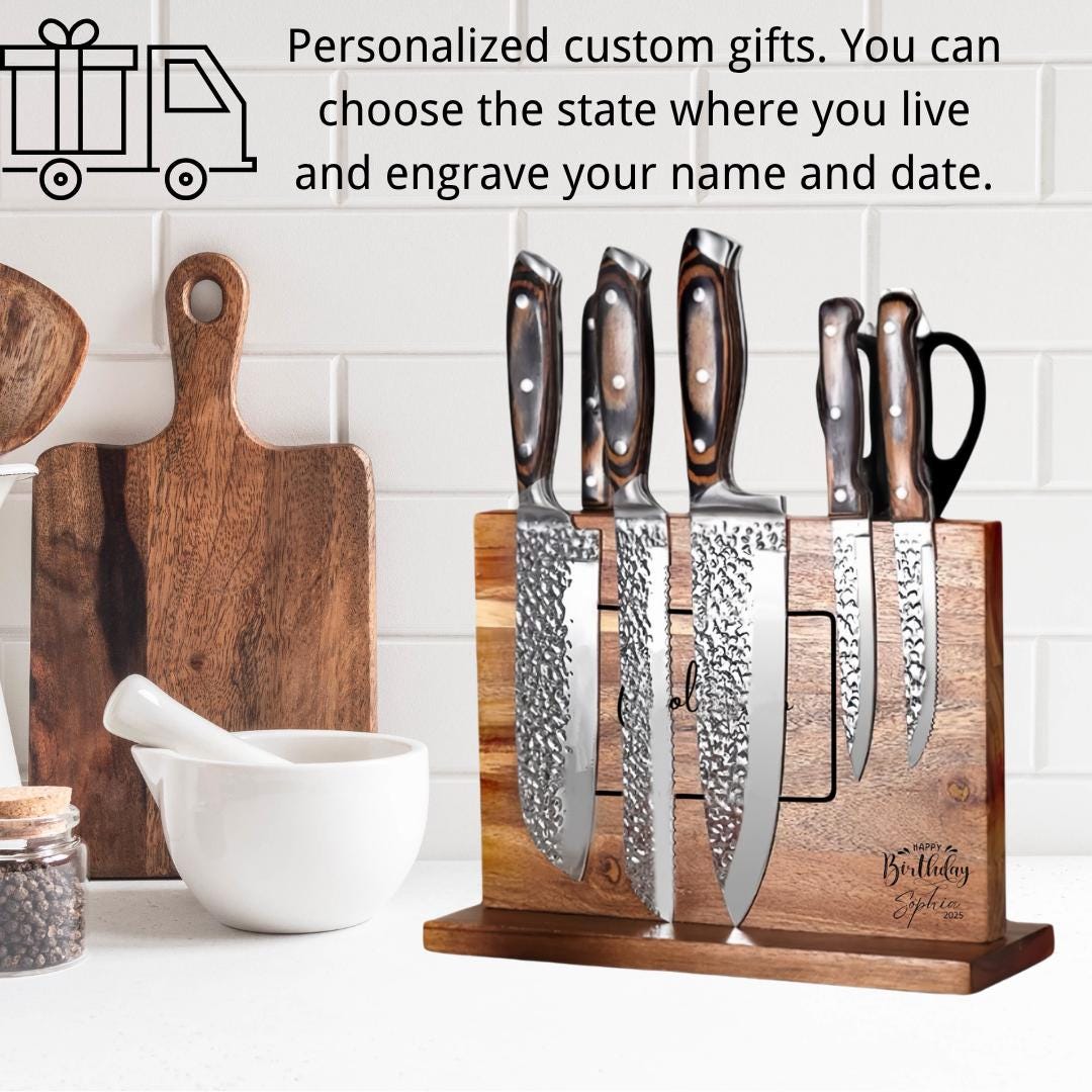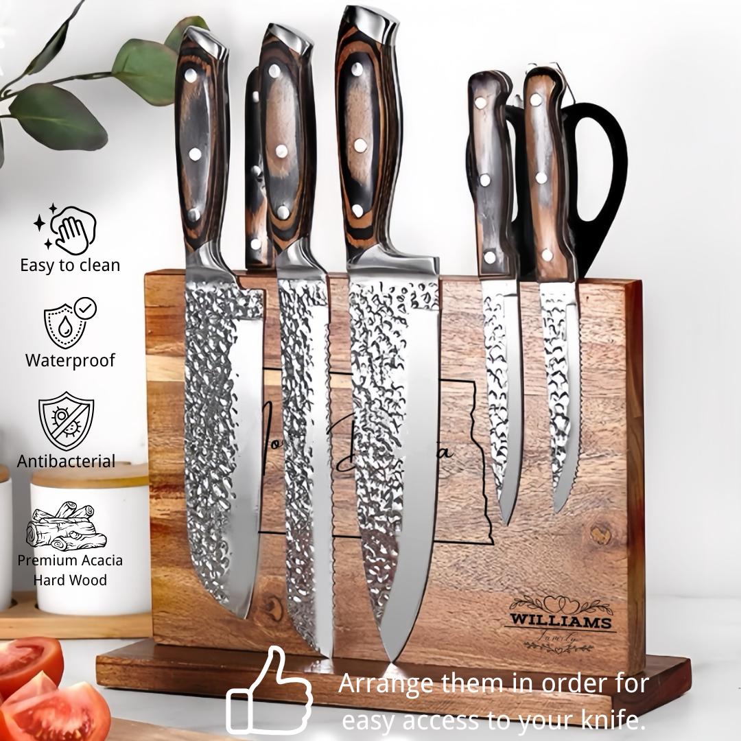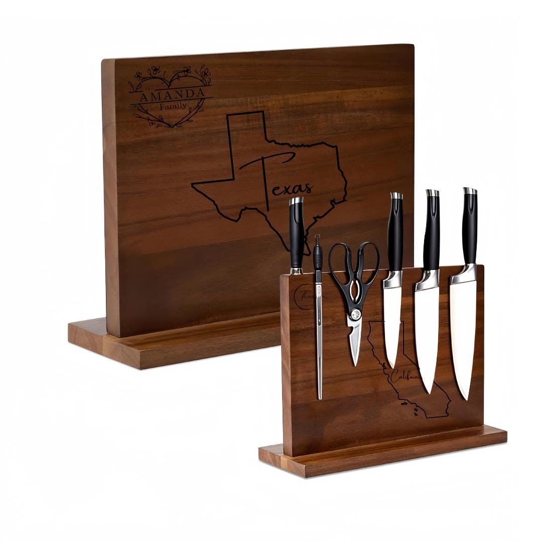 Double-sided strong magnet: The magnetic knife holder is equipped with powerful hidden magnets, covering a wide area and having strong adhesion, effectively fixing the blade. The powerful magnets can safely store all kitchenware and can also be used in tool rooms. You can access the knives more easily and quickly, and safely store kitchen knives. A unique gift for special occasions: Celebrate memorable moments in life with personalized strong magnet knife holders. They are the perfect gift for brides, grooms, mothers, and couples, adding a personal touch of elegance to any occasion. It is not just a kitchenware item, but a truly meaningful keepsake. High-quality craftsmanship: Each strong magnet knife holder is handmade from high-quality cedar wood, featuring unparalleled durability, rich texture, and timeless elegance. Safe for food and non-toxic: Made from 100% natural wood, it contains no harmful chemicals. Create lasting memories: Personalize the shape and name of the state and date on the strong magnet knife holder to make each gift unforgettable. Whether it's a wedding, anniversary, housewarming party, or birthday, it's a perfect gift - carefully crafted, memorable, and worth cherishing. Natural cedar wood: Our knife holders are made from high-quality cedar wood, which is hard and elastic, not prone to folding or cracking, and has a brown luster. The surface of the knife holder is smooth, protecting the knife and keeping the blade sharp. Cedar wood is also easy to clean and maintain, requiring only a damp cloth to wipe. Space-saving and stylish: Our knife holders feature a unique pattern texture, presenting an elegant dark brown color, which can add a special touch to your kitchen or any other area, helping you organize your knives and keep the kitchen countertop tidy.